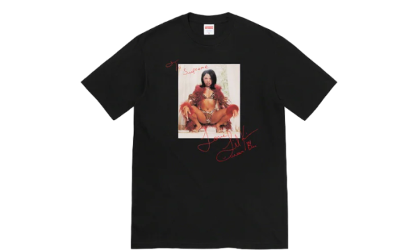 THE Supreme Lil kim tee Black highlights a photo of the Brooklyn rapper on a black background on the chest and the words of the remix of “Quiet Storm of Mobb Deep ” on the back.