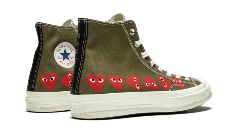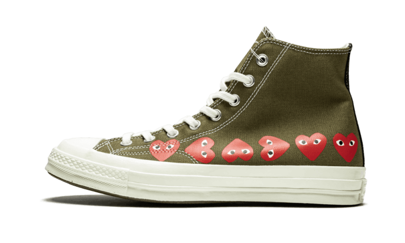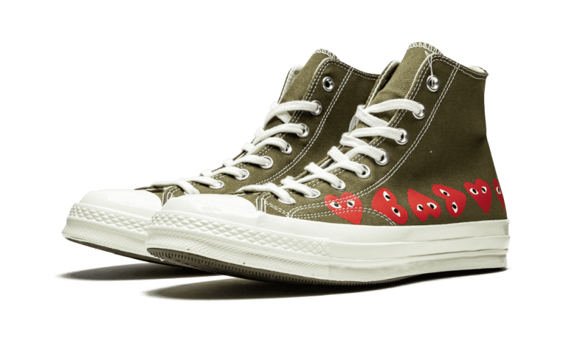 The Converse Chuck Taylor All Star 70s Hi Comme des Garçons PLAY Multi-Heart Green features a khaki green fabric upper, decorated with multiple CDG logos on the medial sides of the pair. Several shades of white can be seen, especially on the laces, eyelets, midsole, and visible stitching. A brown outsole completes the design.