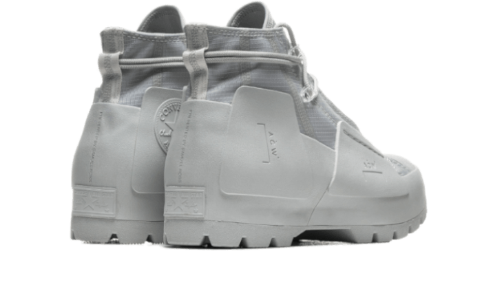 The Converse Chuck Taylor All-Star Lugged Hi A-Cold-Wall Grey features a grey upper and replaces the usual fabric base with ripstop nylon, complemented by rubber overlays. The A.C.W branding highlights the London-based label, while the Converse logos on the inner sides remain true to the design of the original models. Finally, trail-style laces and the chunky lugged sole complete the look.