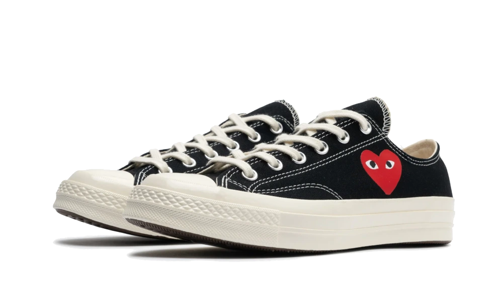 There Comme des Garçons Single Heart Chuck 70 Black Low is characterized by its base in breathable black canvas and its contrasting seams. Its low cut, its metal eyelets, its white rubber end and its cream sole vintage, Refer to the original model. The emblematic red heart, signature of Comme des Garçons, Visible on the side of the silhouette, affirms the collaboration between the two brands.