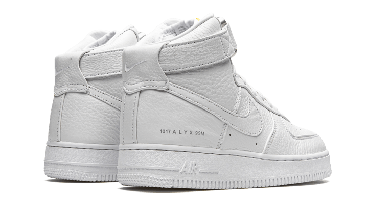 The Nike Air Force 1 High Alyx White (2020) features a monochrome upper in premium white leather with a grained finish. Although the base silhouette remains unchanged, the model incorporates a few new elements such as dubraes displaying “1017” on one side and “9SM” on the other, as well as an anodized aluminium buckle that replaces the usual leather strap. There are also some subtle tone-on-tone details, such as the “1017 ALYX 9SM” inscription on the sides and two mini Swoosh embroidered on the heels.