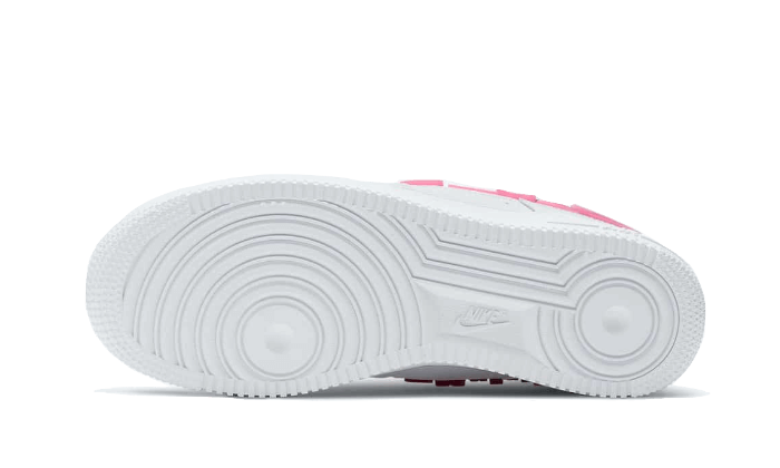 The Nike Air Force 1 Low SE Love for All Valentine’s Day (2021) features a white leather base, complemented by pink Swooshes with “Love” embossed on them.