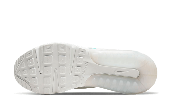 The Nike Air Max 2090 Aurora Green features a translucent semi upper and turquoise layered over a white fabric base. The cut-out Swoosh and the heeltab, true to the DNA of the Air Max 90, are reinterpreted here in a different form. In fact, you’ll notice a Swoosh with only its outline, as well as a ribbed effect on the heel and the back of the new Nike Air unit, specially designed for this model. A perforated tongue, matching laces, and touches of turquoise add the finishing touch to the design.