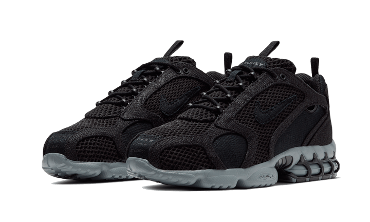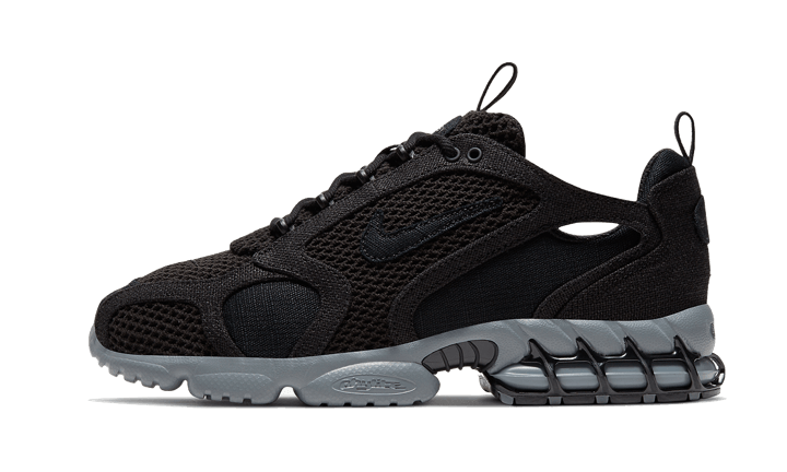 The Nike Air Zoom Spiridon Cage 2 Stussy Black features a black upper alternating honeycomb mesh and canvas with a well-crafted play on textures. The Nike branding appears with a tone-on-tone Swoosh and that of Stussy on the heel and tongue. Finally, matching laces and a grey sole equipped with Air Zoom technology complete the design.