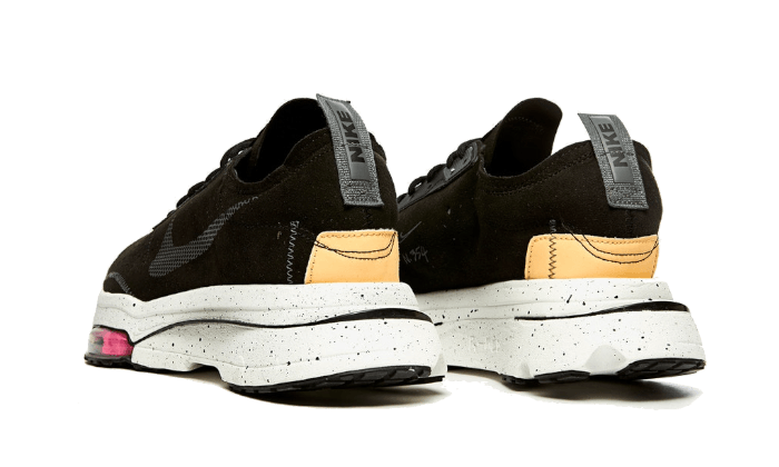 The Nike Air Zoom-Type Black Hyper Pink features a black suede base enhanced by a honeycomb pattern Swoosh on the lateral sides. The midsole is presented in speckled white. The Zoom Air units visible at the forefoot are rose fuchsia for a subtle pop of