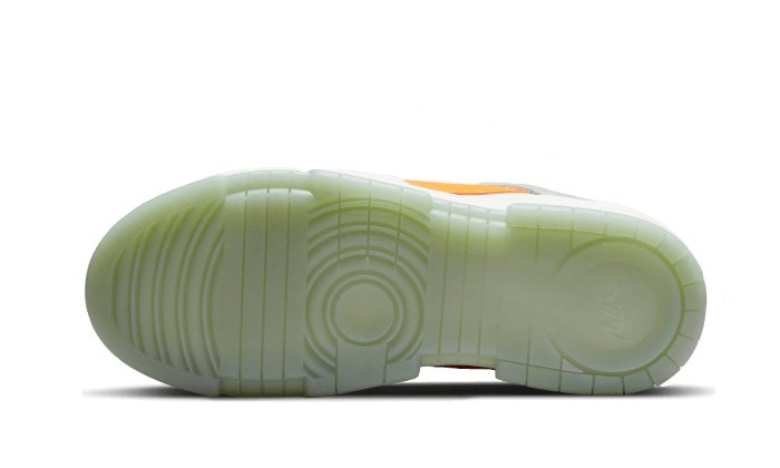 The Nike Dunk Low Disrupt Sea Glass features an upper in off-white mesh . Slightly grained leather overlays, found on the various layers, opt for light green. A vibrant orange Swoosh elevates the look, while a two-tone sole echoes the upper’s